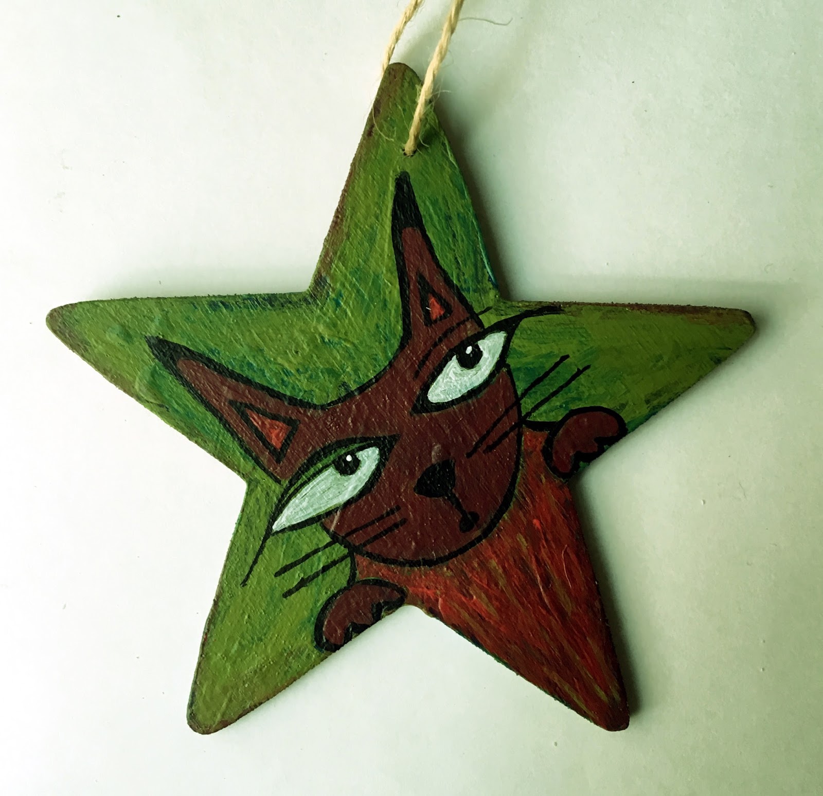 I love these naughty kitties! When I was painting the trees, they seemed so boring and plain. I thought to myself, what would liven them up? Well, cats of course! Cats make everything better, don't they? These are wooden ornaments painted with acrylics, about 4x6" and available in my Etsy Store if interested. Happy Holidays!!